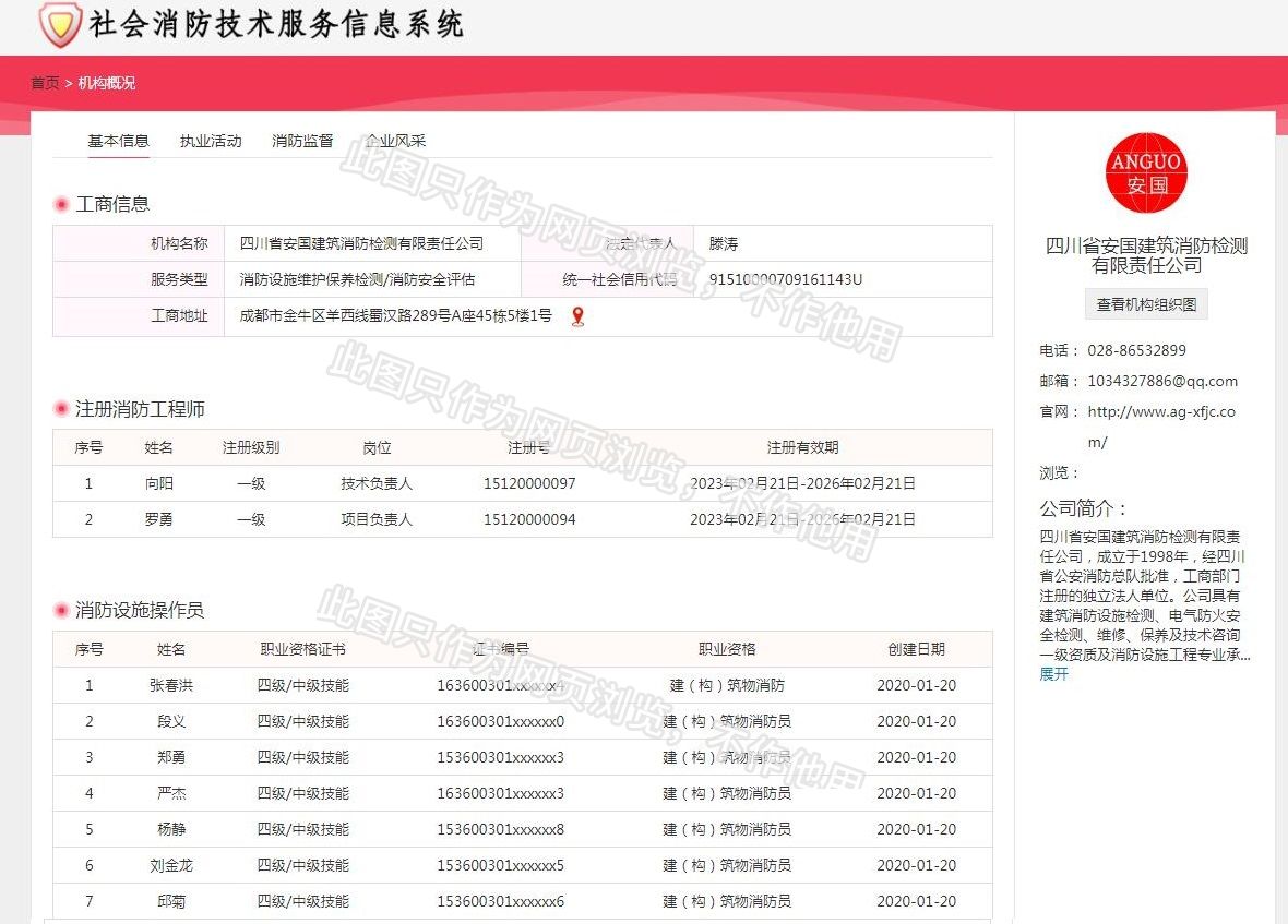 四川省安國建筑消防檢測有限責任公司,成立于1998年,經四川省公安消防總隊批準,工商部門注冊的獨立法人單位。 公司具有建筑消防設施檢測、電氣防火安全檢測、維修、保養及技術咨詢一級資質的中介技術服務機構,獲得CMA計量認證。主要業務范圍是:接受建設單位或有關單位委托,承擔新建、改建、擴建建筑自動消防設施技術檢測、電氣防火安全檢測、以及承接建筑消防設施維護保養,對已交付使用的建設消防設施的運行情況進行運行檢測,開展建筑消防設施的消防安全技術咨詢。公司設辦公室、總工辦、財務部、檢測部、維保部等職能機構,擁有一